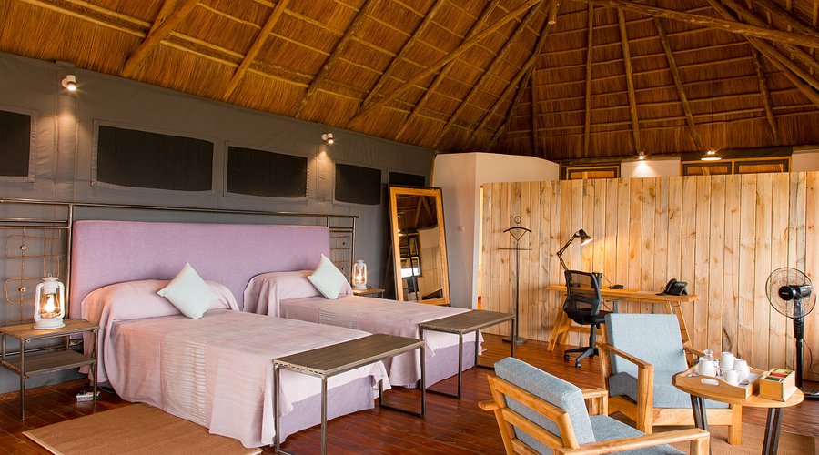 숙소는 럭셔리 텐트형 스위트룸으로 설계되었으며, 내부 인테리어는 자연 요소와 현대적 편안함을 조화롭게 결합했습니다.