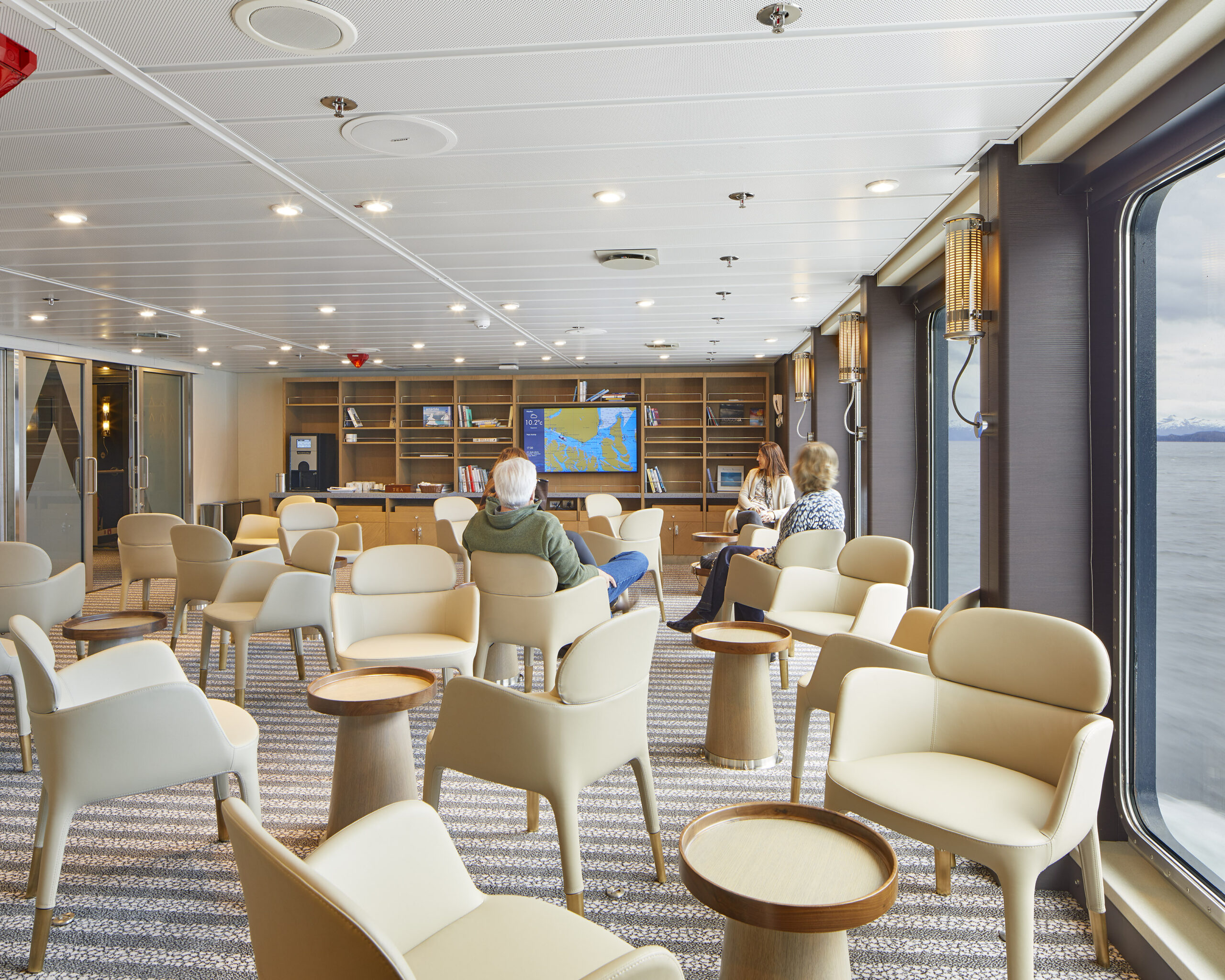 유리로 둘러싸인 전망 라운지와 첨단 시청각 장비가 갖춰진 프레젠테이션 룸에서 남극의 풍경을 감상하며 편안한 시간을 보낼 수 있습니다.